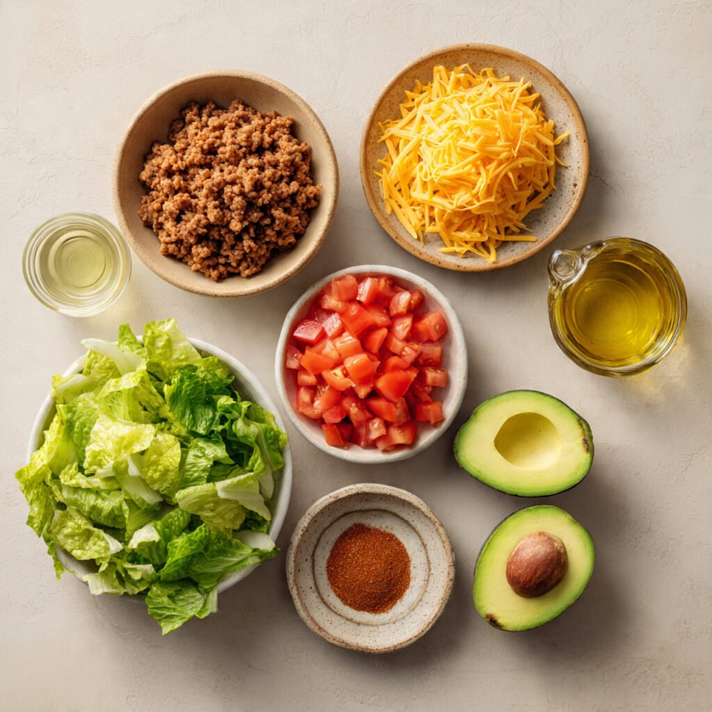 - Prep Ingredients: Dice tomatoes, shred lettuce, slice avocado, and measure out taco seasoning while your pan heats up.