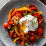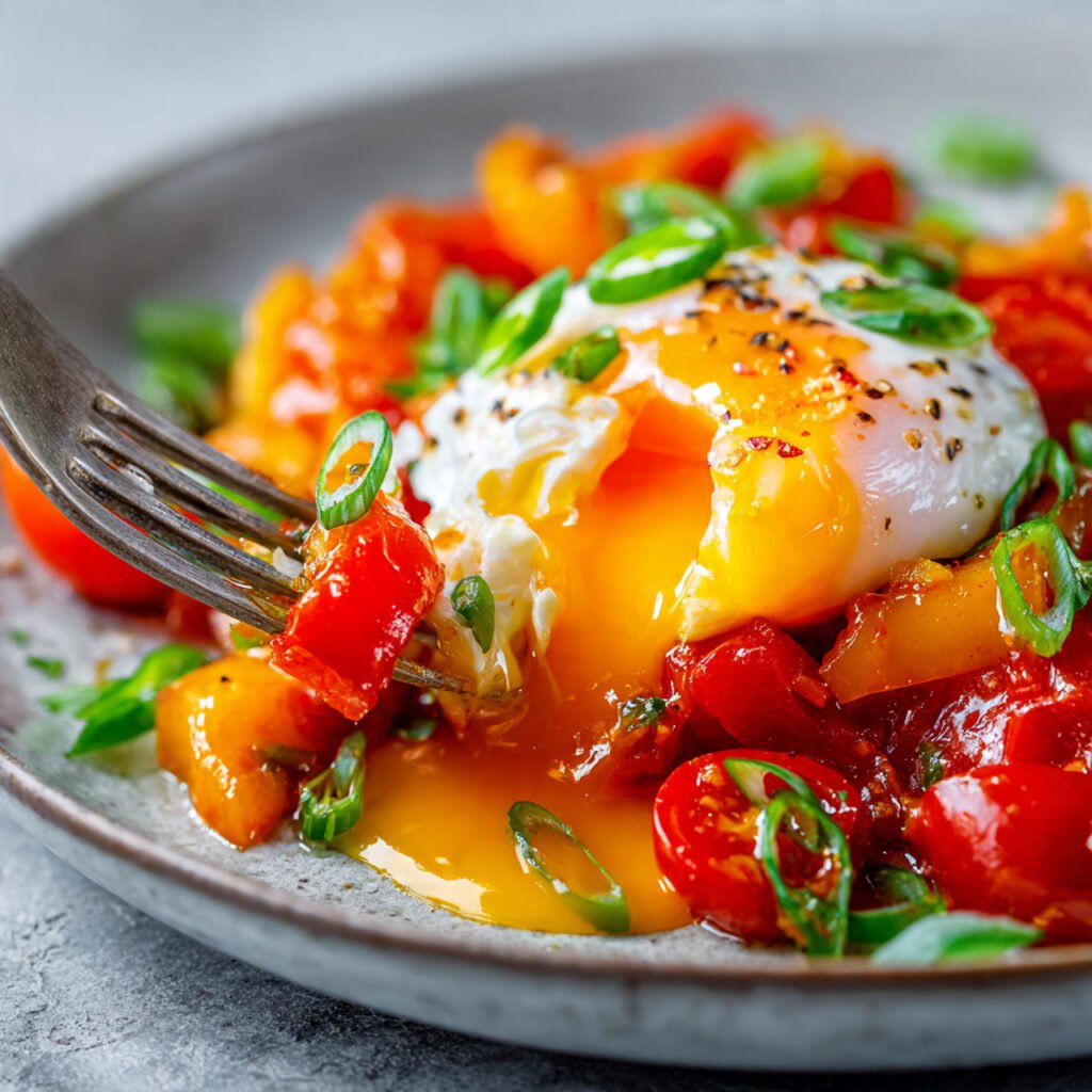 This Sardinian Peperonata with Poached Eggs combines silky roasted peppers, tomatoes, onions, and garlic with perfectly poached eggs for a protein-rich Mediterranean breakfast or dinner. Perfect for anyone seeking vibrant flavors that support muscle health, metabolic flexibility, and longevity without the blood sugar rollercoaster of traditional breakfast foods.