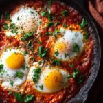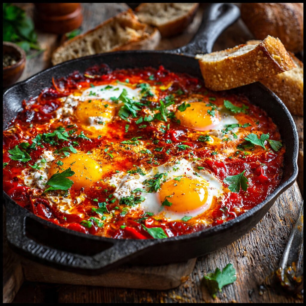 - Garnish and serve: Remove from heat. Sprinkle with fresh parsley, cilantro, and crumbled feta if using. Serve immediately, scooping eggs and sauce together. Accompany with warm bread for dipping into the flavorful sauce and runny yolks.
