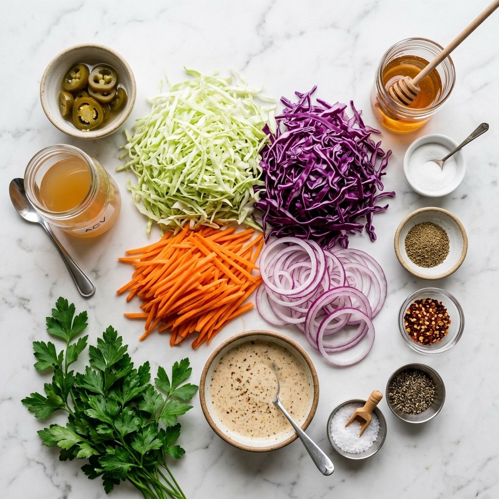 Step 6: Taste and adjust seasoning with more salt, pepper, honey for sweetness, or cayenne for heat. Serve chilled or at room temperature. Garnish with extra cilantro and a sprinkle of seeds. The slaw should be crunchy, tangy, slightly sweet, and have a gentle kick of heat.